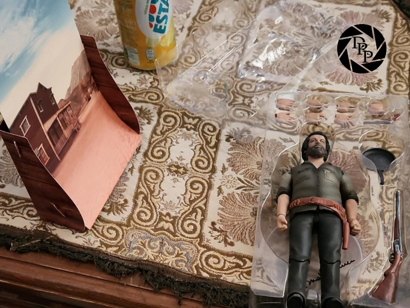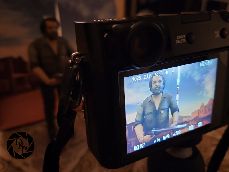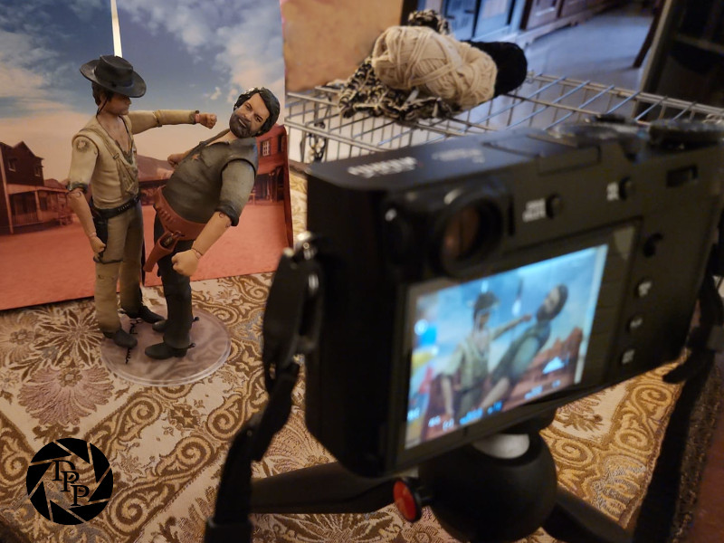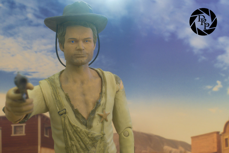 Il problema che più può impensierire era quello dello sfondo. Personalmente, non avrei voluto uno sfondo neutro, come un fondale uniforme (nero, bianco o di qualche colore particolare), ma piuttosto un bel fondale a tema. Potremmo pensare a come ricreare un finto scenario western in giardino, ma le due action figure sono fornite di diorama in cartone. Peccato che per i miei scopi fossero un po’ troppo stretti! Ho risolto mettendoli entrambi uno accanto all’altro e lavorando un pochino in post-produzione per fonderli.