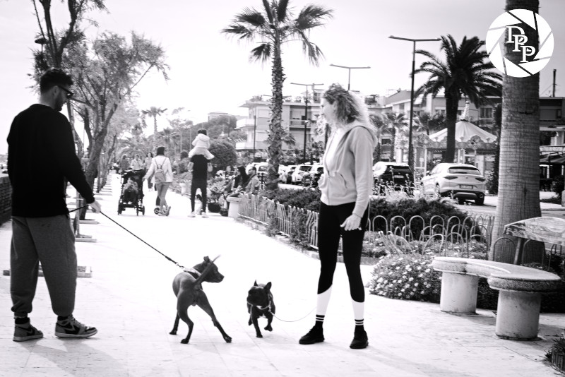 Trovare un gatto per strada è cosa comune e di certo è un buon soggetto da fotografare, soprattutto per appassionati, ma nella street photography spesso sono i cani a fare da padrone (scusate il gioco di parole). Ce ne sono di buffi, di alteri, di entusiasti, di impassibili: basta scegliere il momento giusto. Ultimamente, sembra che sempre più persone portino a spasso il loro cane durante il fine settimana e su un lungomare, per esempio, non è difficile trovarne a iosa, pronti per essere fotografati.